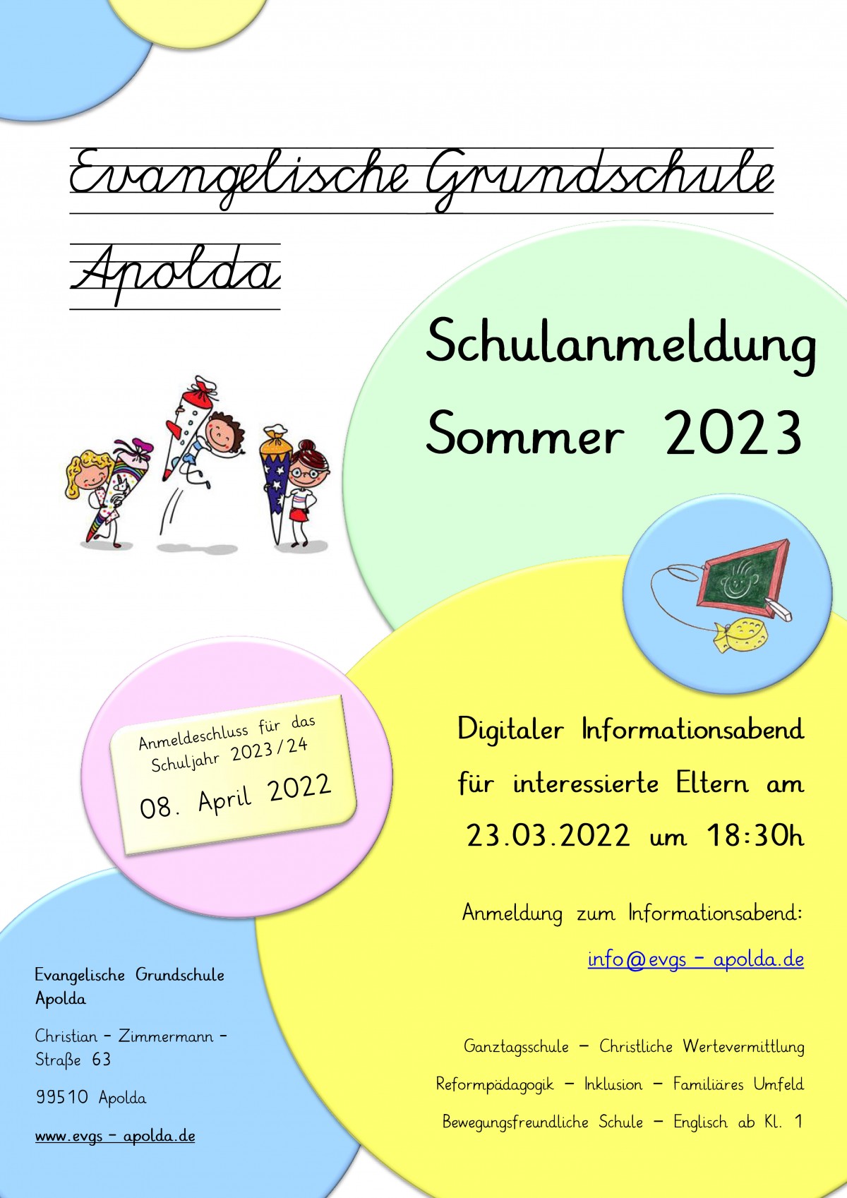 Nach der Anmeldung erhalten Sie den Link zur Online-Veranstaltung sowie den Hinweis, dass eine Schulanmeldung für das Schuljahr 2023/2024 bis spätestens 08. April 2022 an der Evangelischen Grundschule Apolda erfolgen muss.
