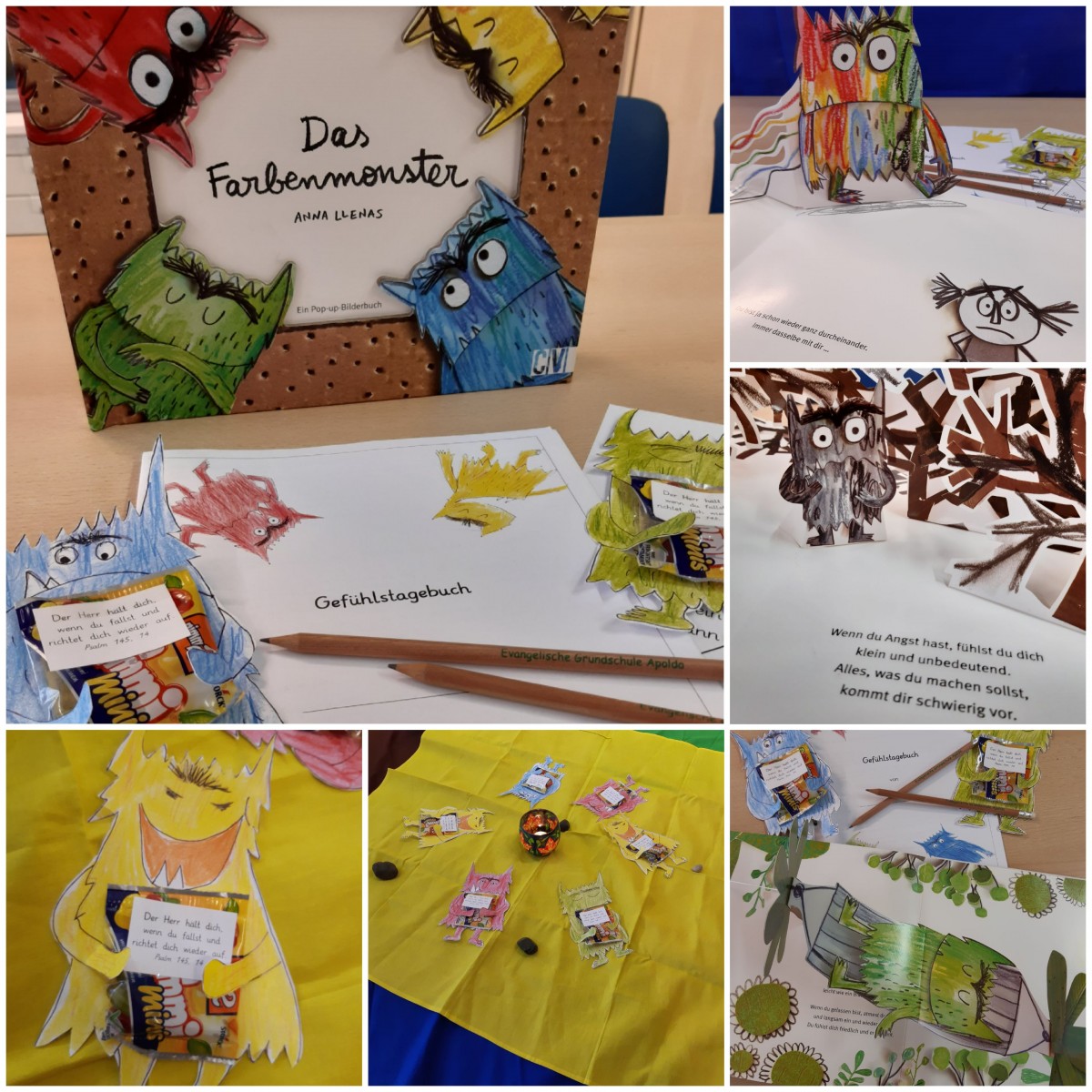 Anhand des wunderbaren Pop-Up Bilderbuchs "Das Farbenmonster" von Anna Llenas beschäftigten sich die Kinder mit den Gefühlen Freude, Gelassenheit, Wut, Angst und Traurigkeit. Dazu erstellten sie ein Gefühlstagebuch, machten eine Fantasiereise, spielten ausgelassen auf dem Hof und bastelten ein "Wut-Rad" sowie eine Mut-mach-Maus. Zum Abschluss gab es noch ein kunterbuntes Gefühlspicknick.