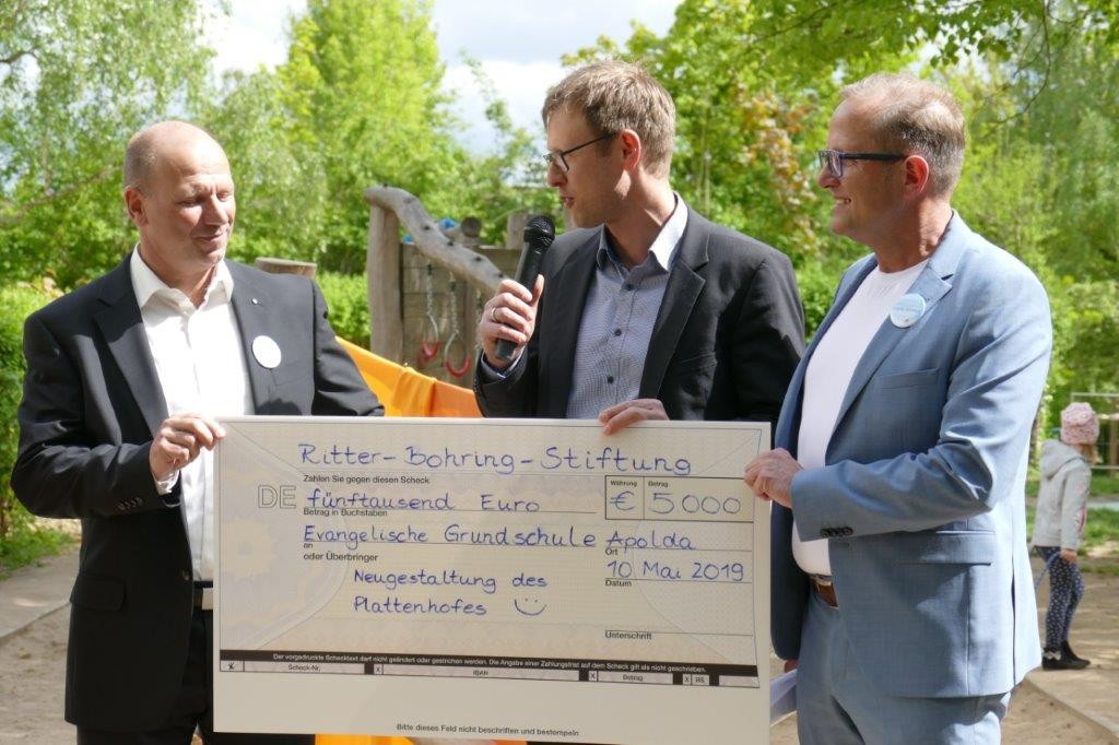 Tolles Schulfest mit vielen Gästen, Sonnenschein und einer Überraschung von 5.000€ Die "Königstiger" (Kl. 1/2) begeisterten die zahlreichen Gästen mit einem komplett englisch-sprachigem Theaterstück. Auch die anderen Klassen sangen englische Lieder - teils von den Schülern selbst auf Gitarre begleitet. Am Ende des Rahmenprogramms überraschte Herr Dr. Müller-Leddin von der Ritter-Bohring-Stiftung alle Anwesenden mit einem Scheck über 5.000€ an den Förderverein. Dieses Geld soll in die Sanierung und Neugestaltung des Schulhofes investiert werden.