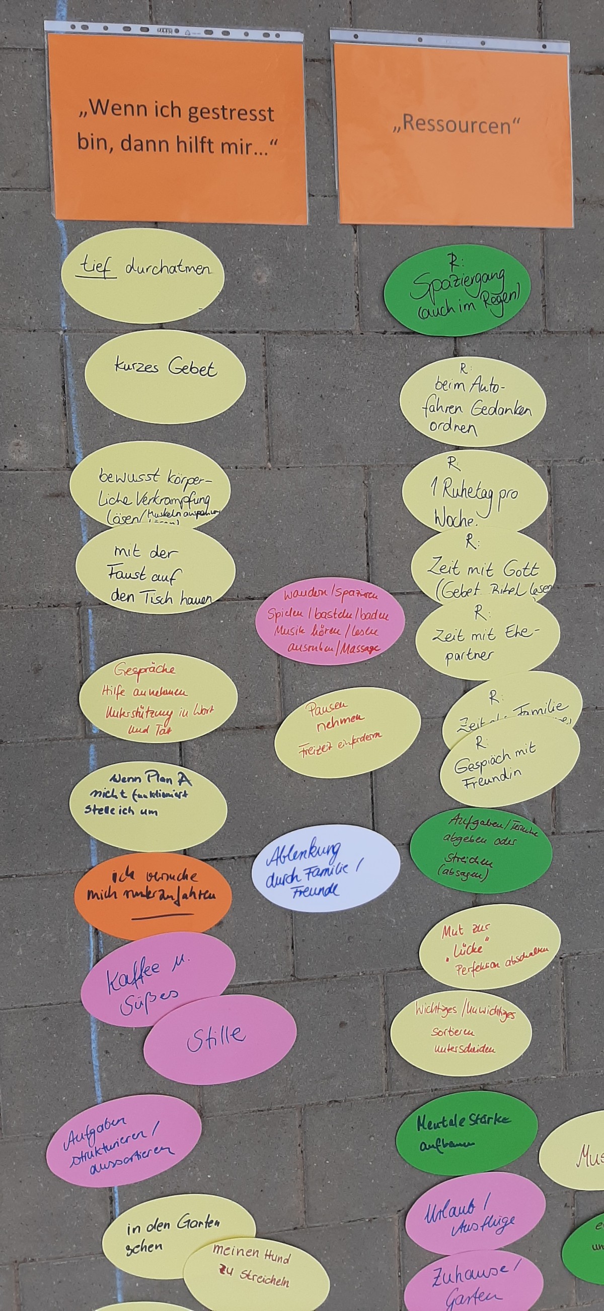 Mit den neuen Herausforderungen kommen auch Stressfaktoren bei den Pädagogen hinzu. Wir haben uns daher Zeit genommen, diese genau in den Blick zu nehmen: Was stresst mich? Was hilft mir kurzfristig / langfristig? Wie und welche kann ich Ressourcen aufbauen? Was können wir uns als Team (gegenseitig) stärken?