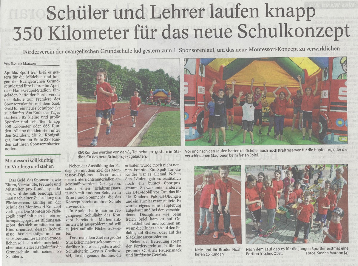 Große (Lauf-)Freude während des 1. Sponsorenlaufs Insgesamt 865 Runden - oder 350 km - liefen die Kinder der Evangelischen Grundschule Apolda im Apoldaer Stadion. Der Förderverein hatte erstmals einen Sponsorenlauf gemeinsam mit der Schule organisiert. Als Sponsoren der Kinder standen Eltern, Verwandte, Freunde, Firmen und sogar ein Kinderarzt zur Seite.